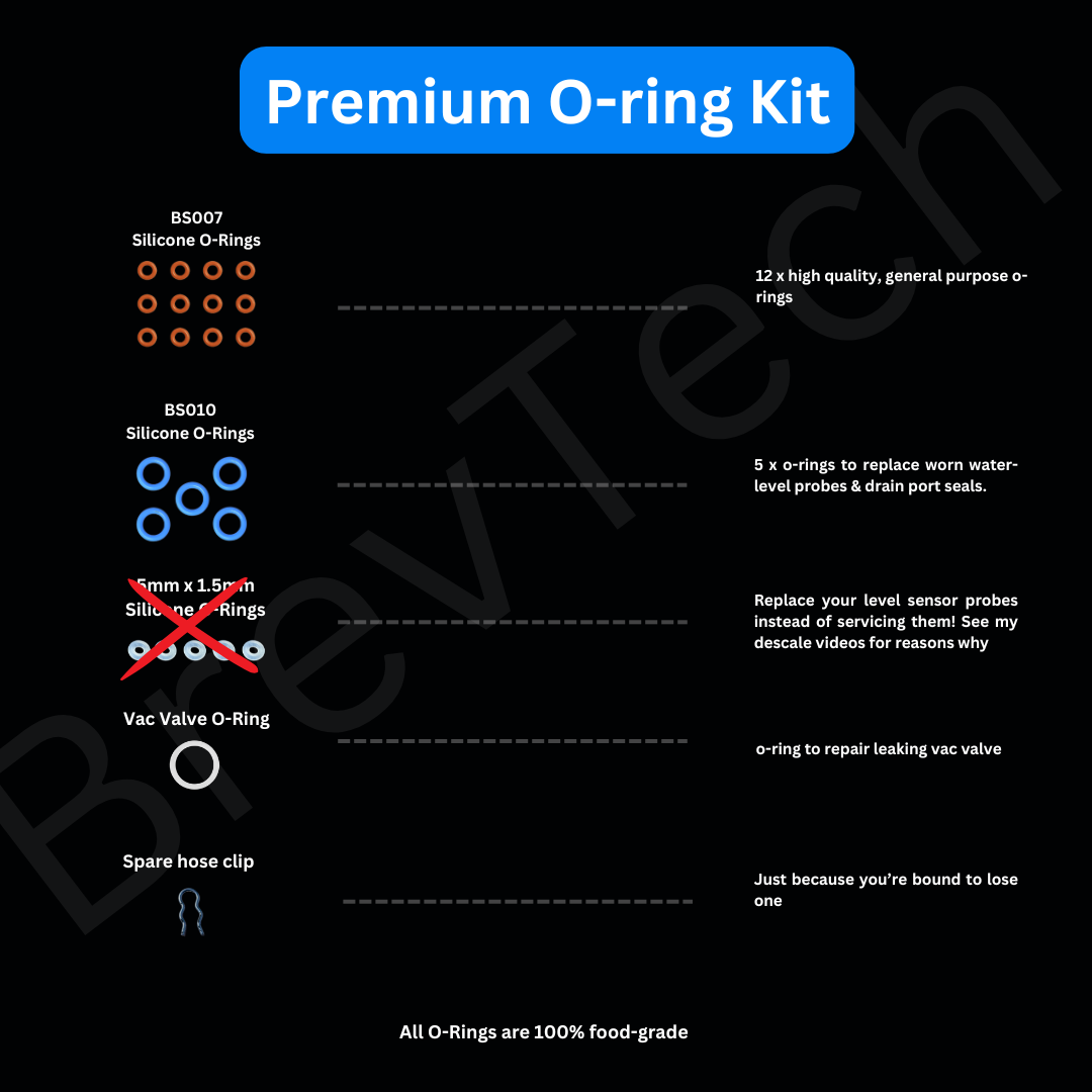 - 5x Large o-rings for thermal and water level probes. ⚠️ We recommend you always replace the probes rather than just the seals, due to the increased risk with descaling.