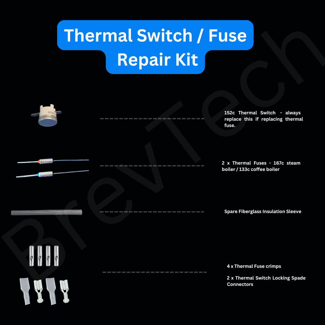 Should the worst happen, then this will get you back on track. You'll get both types of fuses to cover any of the thermal fuses in the machine. There is also a steam boiler thermal switch as you'll likely need this if your machine has the 3 beeps of death. And finally, some locking connectors (important as non locking ones often fall off) and some spare insulation tubing incase yours is too short.